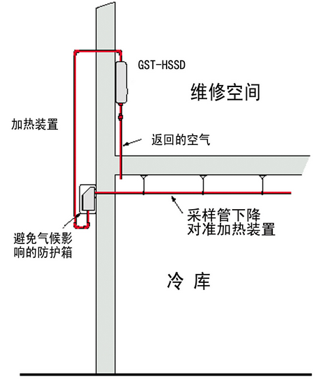 冷庫中采樣管,加熱箱和吸氣式感煙火災(zāi)探測器的相對(duì)位置